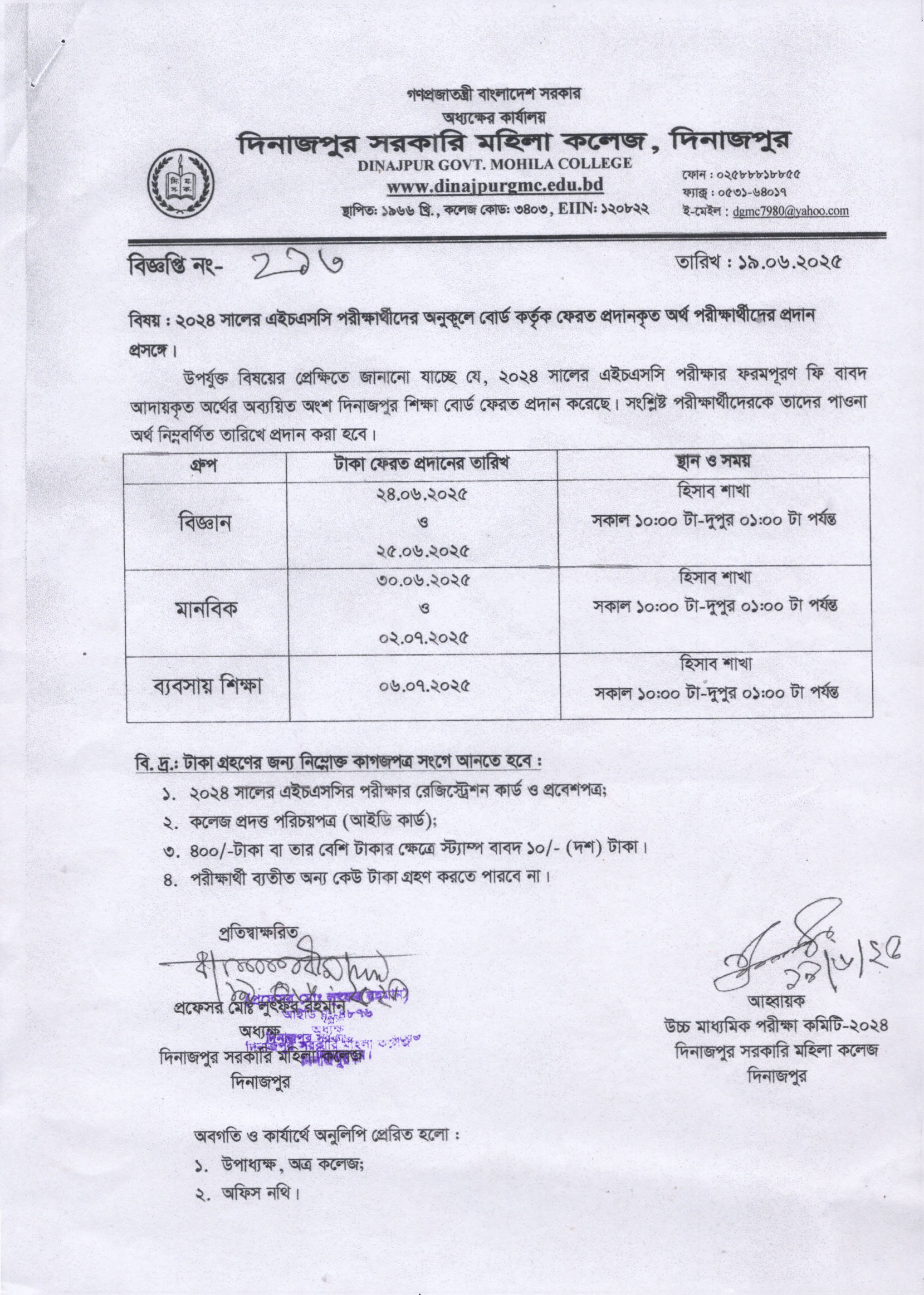 ২০২৪ সালের এইচএসসি পরীক্ষার্থীদের অনুকূলে বোর্ড কর্তৃক ফেরত প্রদানকৃত অর্থ পরীক্ষার্থীদের প্রদান প্রসঙ্গে।