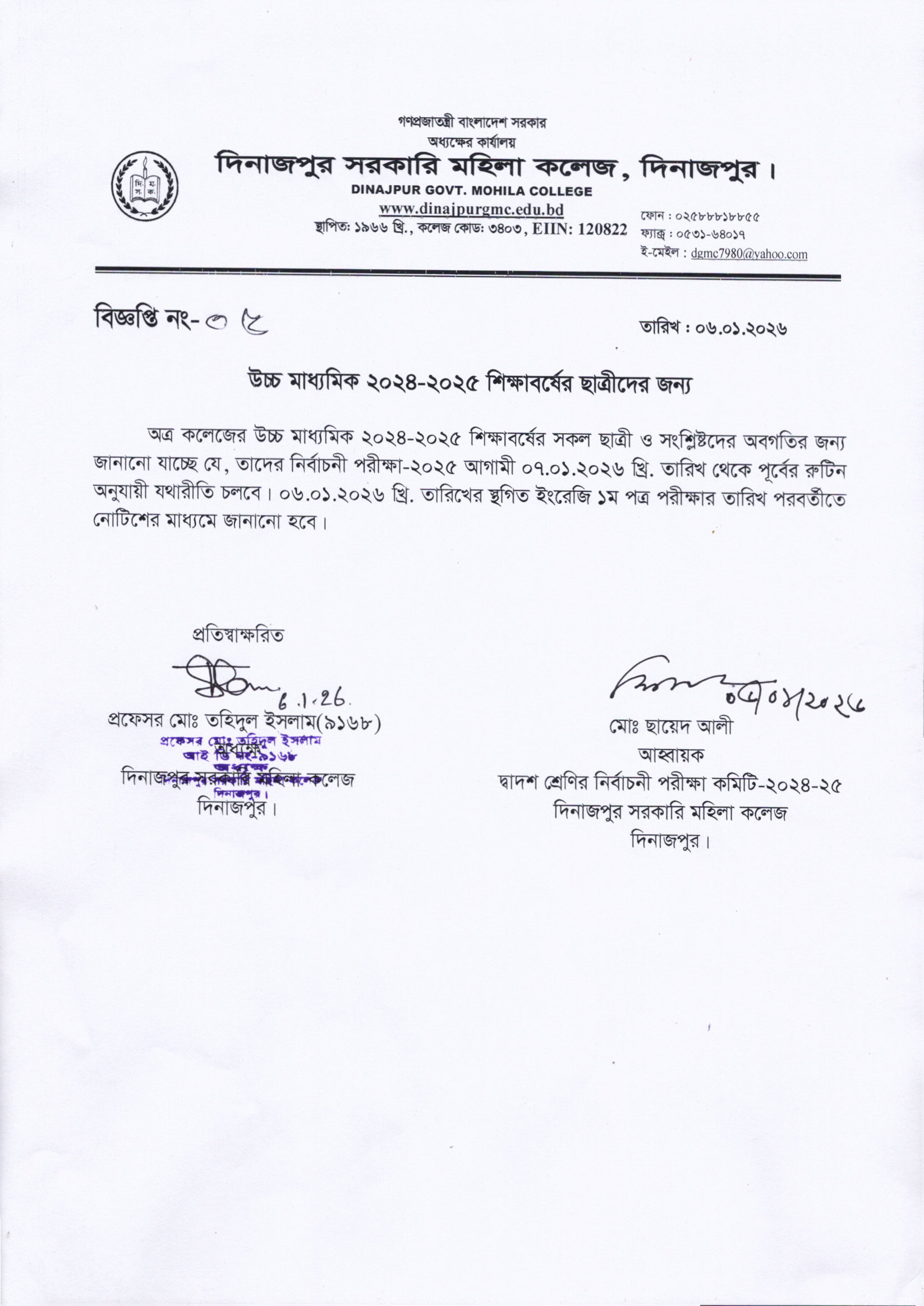 উচ্চ মাধ্যমিক ২০২৪-২০২৫ শিক্ষাবর্ষের নির্বাচনী পরীক্ষা -২০২৫ এর বিজ্ঞপ্তি।