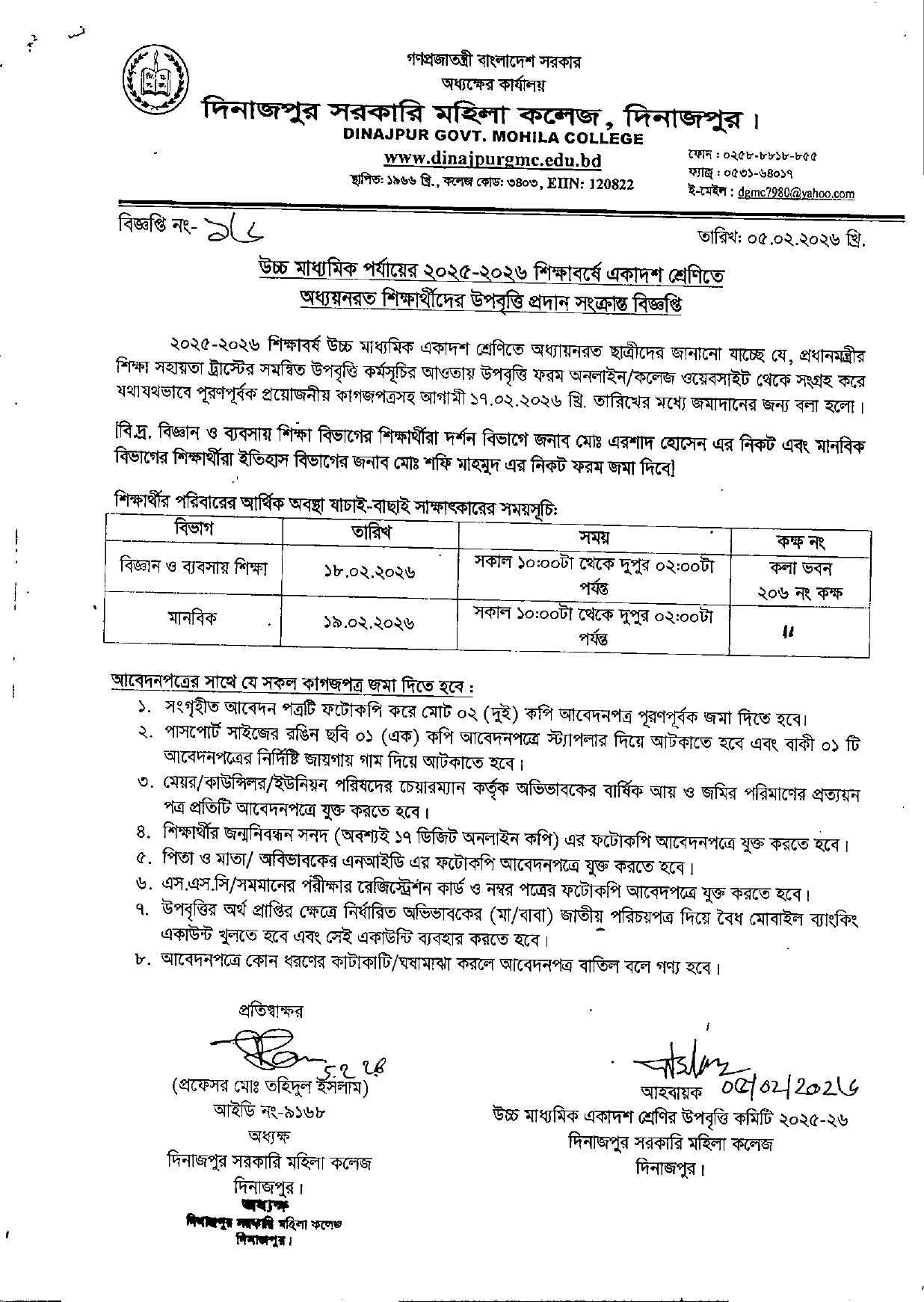 উচ্চ মাধ্যমিক পর্যায়ের ২০২৫-২০২৬ শিক্ষাবর্ষে একাদশ শ্রেণিতে অধ্যয়নরত শিক্ষার্থীদের উপবৃত্তির বিজ্ঞপ্তি।